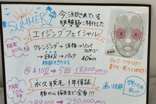 フェイシャル、脱毛、リンパマッサージ、まつ毛エクステ等